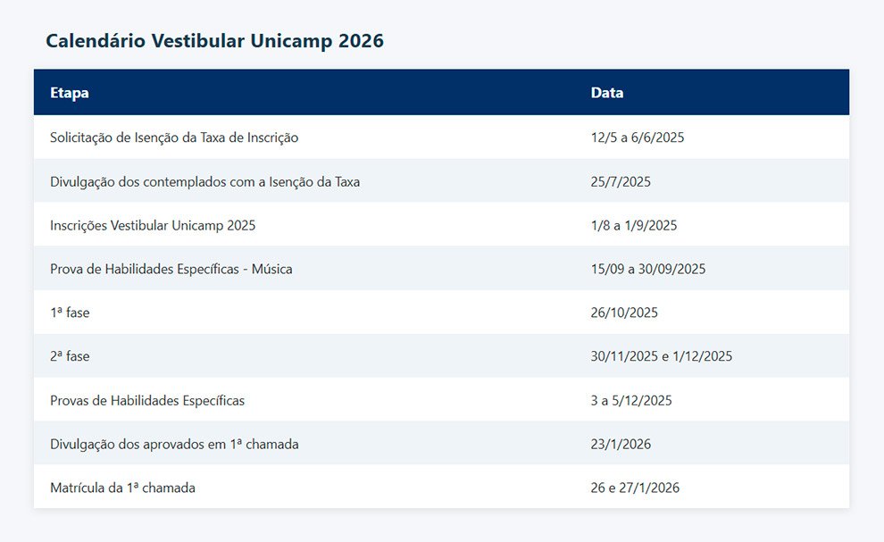 Unicamp abre inscrições do Vestibular 2026 nesta sexta (1) A Comissão Permanente para os Vestibulares da Unicamp (Comvest) abre as inscrições do Vestibular 2026 nesta sexta-feira (1). O prazo vai até 1º de setembro pela internet. Os candidatos devem ter concluído o ensino médio ou com…