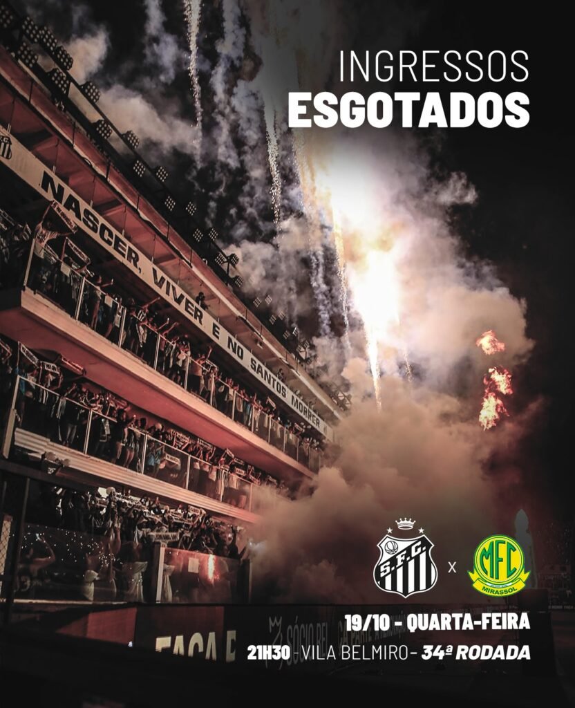 Os ingressos para a partida entre Santos FC e Mirassol, que acontecerá nesta quarta-feira (19), pelo Campeonato Brasileiro, na Vila Belmiro, estão esgotados. Em caso de desistência, nova carga poderá ser disponibilizada.