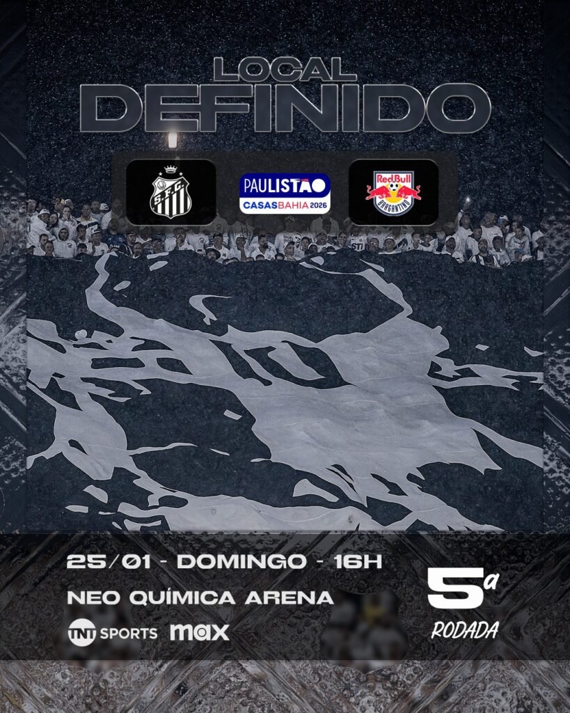 Atenção, nação santista! Informação importante sobre o jogo contra o Red Bull Bragantino! A partida será realizada na Neo Química Arena, no dia 25, às 16h.