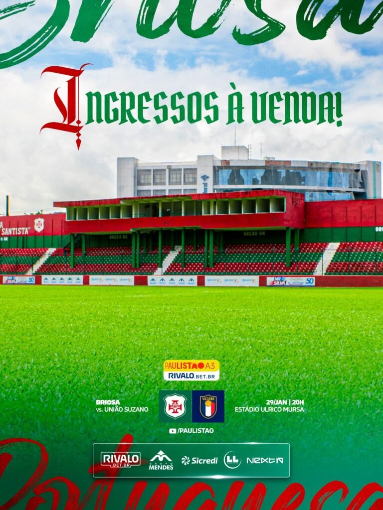 Foto: Agência Briosa A Portuguesa Santista iniciou a venda de ingressos para o duelo contra o União Suzano, válido pela 2ª rodada do Paulistão A3. A partida será disputada na próxima quinta-feira (29), às 20h, no Estádio Ulrico Mursa. A Briosa chega embalada após vencer o Bandeirante fora…