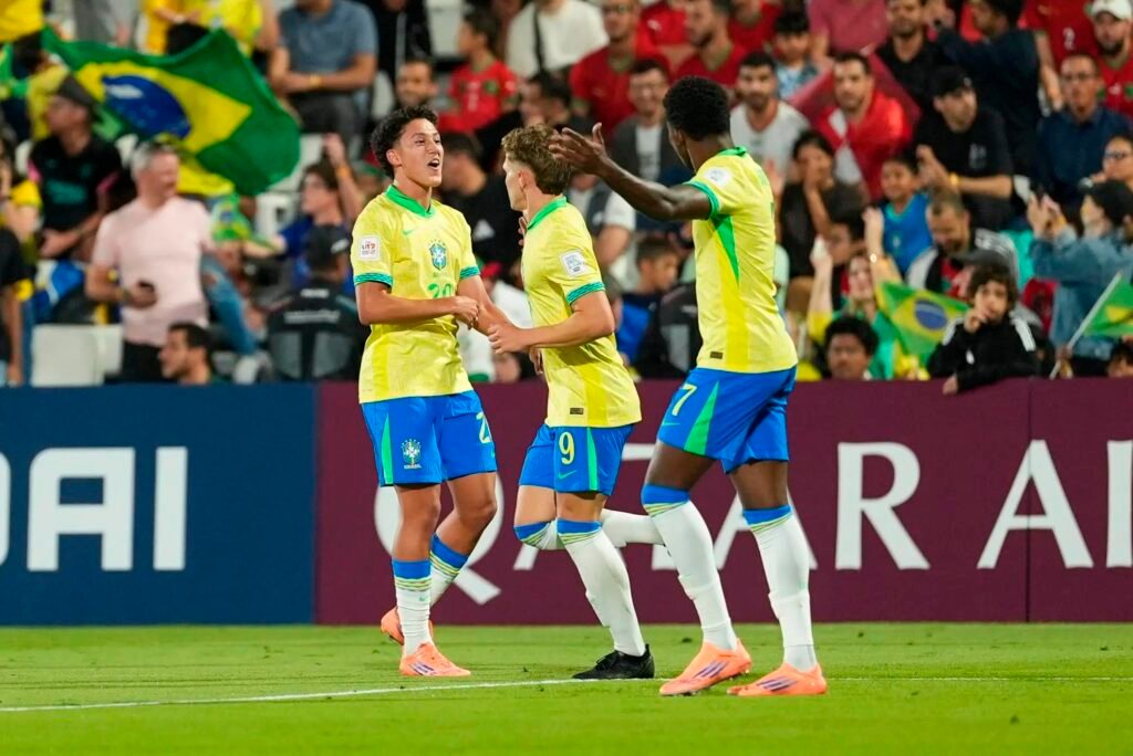 A Seleção Brasileira Sub-17 garantiu sua vaga na semifinal do Mundial da categoria nesta sexta-feira (21) ao superar Marrocos por 2 a 1, no Estádio Aspire Zone, em Doha. Em mais uma partida recheada de emoção e reviravoltas, o jovem Dell foi o herói da Amarelinha, marcando os dois gols, incluindo o decisivo aos 49 minutos do segundo tempo. O Brasil agora enfrentará Portugal na semifinal, em confronto agendado para a próxima segunda-feira (24).
