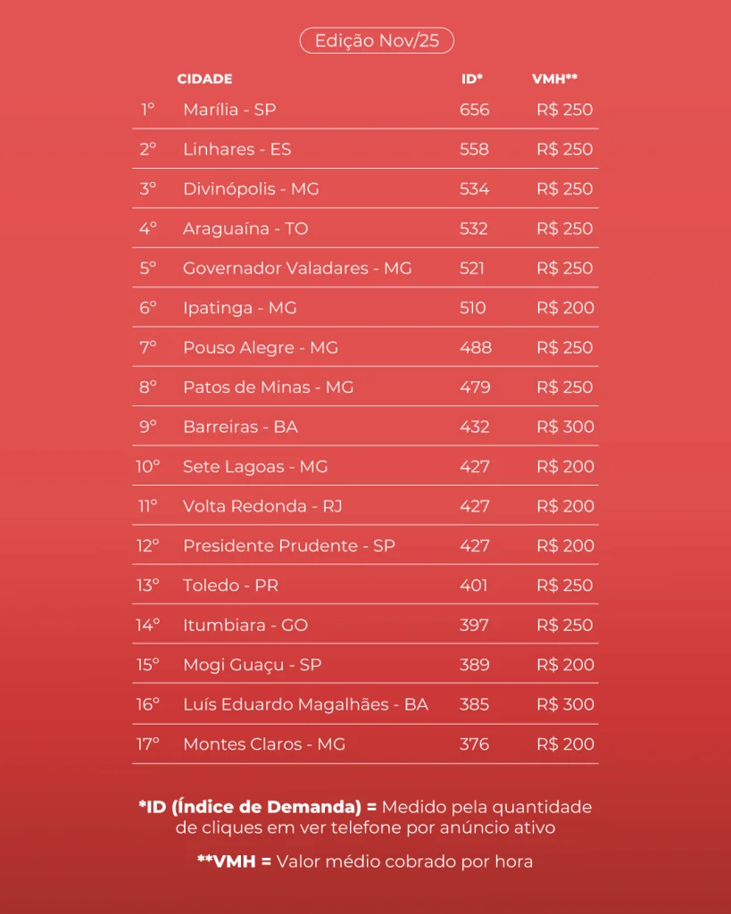Um novo estudo divulgado pela Fatal Model, maior plataforma de anúncios de acompanhantes do Brasil, revelou que uma cidade do interior paulista desbancou grandes capitais e garantiu o primeiro lugar no Índice de Demanda (ID) no país. O levantamento analisou municípios com mais de 100 mil habitantes e destacou os 50 melhores colocados.