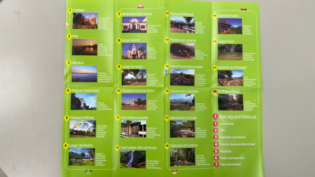 O guia apresenta 22 pontos turísticos que destacam a diversidade histórica, cultural e ambiental do município. Entre os destaques estão o Píer do Jardim Casqueiro, ideal para contemplação do pôr do sol; as náuticas na Ilha Caraguatá, onde natureza e esportes se encontram à beira d’água. Os parques também ganham protagonismo, como o Parque Cotia-Pará, com trilhas ecológicas, e o Parque Anilinas, espaço de lazer, cultura e convivência para toda a família. No Centro, locais como o Largo de Aveiro, a Biblioteca Municipal, a Igreja Matriz e o Largo do Sapo reforçam o valor histórico e cultural da cidade, enquanto o Cruzeiro Quinhentista e o Cemitério Israelita representam marcos de fé e diversidade, entre outros pontos.