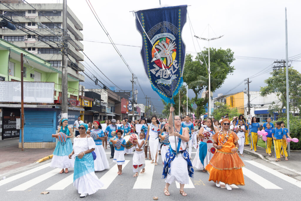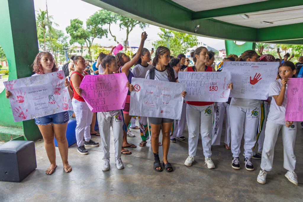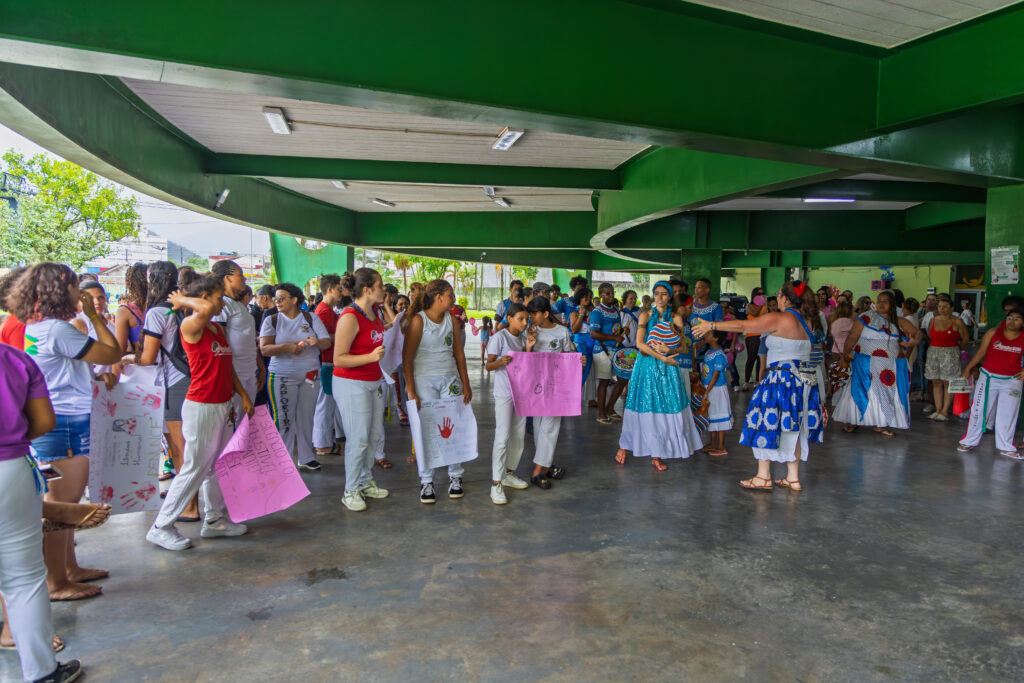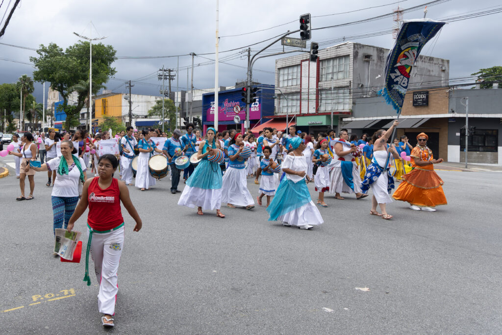 Durante o trajeto, participantes exibiram cartazes e mensagens de conscientização produzidos por grupos de capoeira de Cubatão, Santos, São Vicente, Praia Grande, Guarujá e São Paulo, reforçando a união regional na luta por respeito, dignidade, justiça e pela preservação da vida das mulheres.