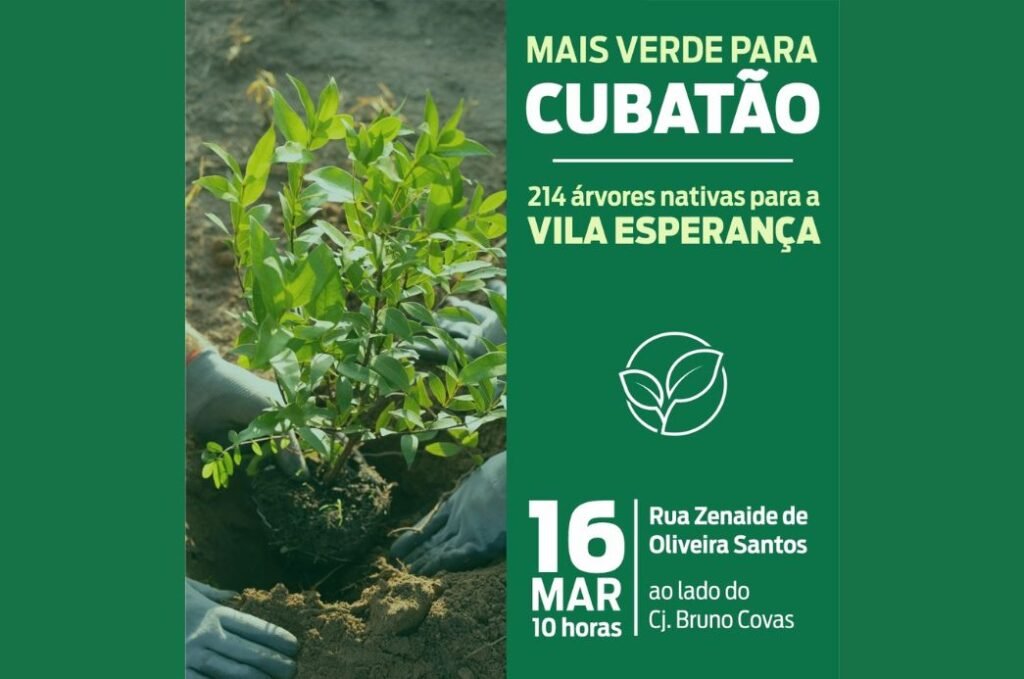 A Prefeitura de Cubatão realiza nesta segunda-feira (16), a partir das 10h, o plantio de 214 mudas de espécies nativas na região da Vila Esperança. Será na Rua Zenaide de Oliveira, próximo ao Conjunto Habitacional Bruno Covas. A ação é conduzida pela Secretaria Municipal de Habitação (Sehab), em parceria com a Secretaria Municipal de Meio Ambiente, Segurança Climática e Bem-Estar Animal, e ocupará, nesta etapa, mais de 750 metros lineares de área verde.