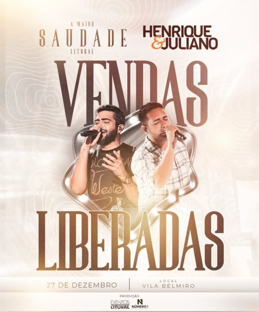 A Vila Belmiro receberá, mais uma vez, o show da dupla sertaneja mais ouvida do Brasil: Henrique & Juliano, que farão uma apresentação histórica, no sábado, dia 27 de dezembro. Os artistas retornam à cidade após o estrondoso sucesso da apresentação realizada há cerca de um ano, que lotou o estádio e teve ingressos esgotados rapidamente. Agora, Henrique & Juliano voltam como atração principal do festival A Maior Saudade, que reunirá mais de cinco atrações de diferentes estilos musicais. A abertura dos portões será às 14h, dando início à programação especial que ocupará toda a tarde e noite com shows.