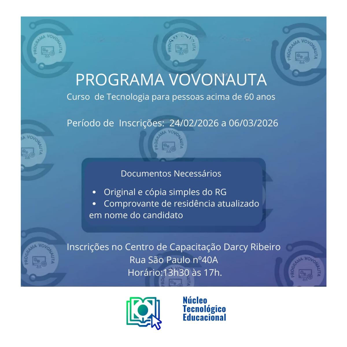 Pessoas com 60 anos ou mais interessadas em ampliar os conhecimentos em tecnologia já podem se inscrever no Programa Vovonauta, em Santos. A iniciativa tem como objetivo ampliar a autonomia no uso das tecnologias e segue com inscrições abertas até 6 de março, oferecendo 60 vagas para o curso de inclusão digital.
