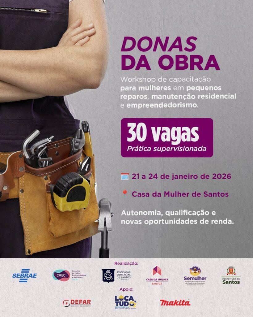 Mulheres interessadas em entrar para o mundo dos reparos e da manutenção podem se inscrever no primeiro workshop Donas da Obra, que será realizado na Casa da Mulher de Santos (Av. Rangel Pestana, 150, Vila Mathias), entre os dias 21 e 24 de janeiro, das 14h às 17h.